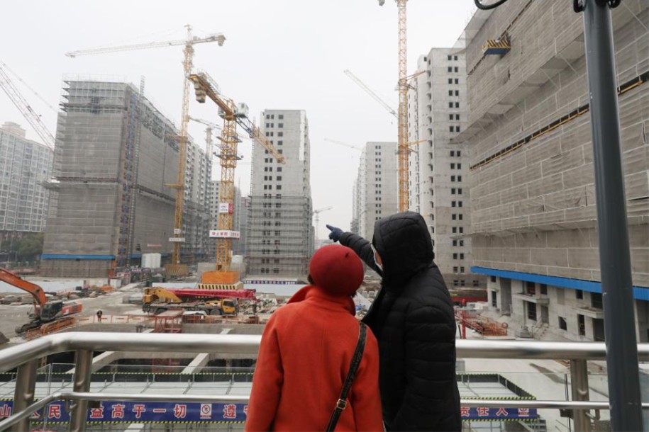 2024年1月10日,兩位市民在中國上海市彭浦新村地鐵站出站天橋上觀看一建設工地。新華社記者 方喆 攝